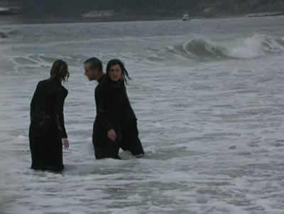 Mirando á cámara e sentindo o mar. No medio das rochas abruptas e salvaxes. Nese punto no que sempre sentimos a inmensidade, neses momentos nos que nos parece que estamos no fin de todo e tamén no comezo. Nese lugar, onde sempre pensamos que este mar nosos nos trouxo e nos levou. Mariñeiros de terra. O ar batía con forza e traía gotas salgadas.