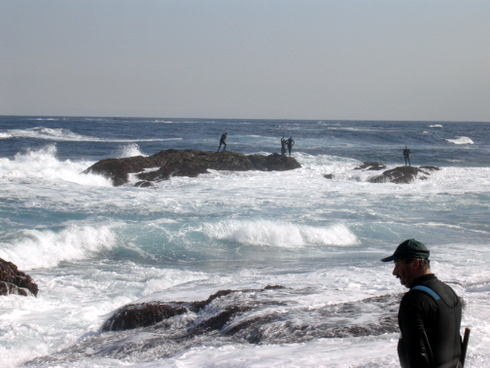 Paseo de Corme, despois de comer no Restaurante Miramar. Uns nenos pescan o caron do mar, frente as mexiloeiras. A tarde e tranquila, escoitase a actividade do pobo e o rumbar das ondas do mar que baten contra o muro do paseo.