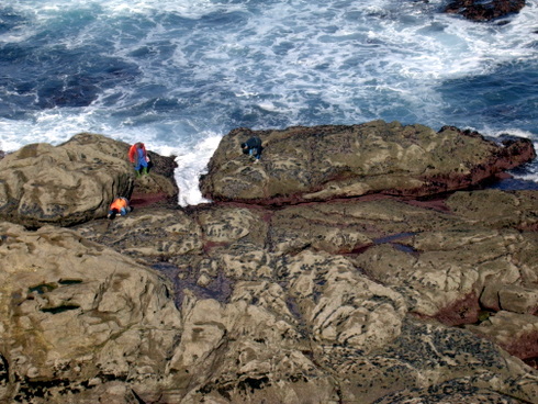 Estamos perto da Punta de Roncudo, en Corme. Dúas mulleres apañan percebes e a marea vai subindo. Xa é horade recoller.