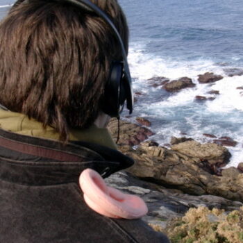 Paseo por Corme. Punta de Roncudo, á dereita do Faro. Son as catro da tarde do día 2 de abril e o mar bate forte contra as rochas.