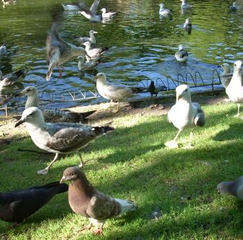 Gaivota, patos, pombas e ocas, son alimentadas polos visitantes do parque de Castrelos de Vigo. Os sons que se escoitan son as voces ameazantes dos paxaros que loitan polo pan.