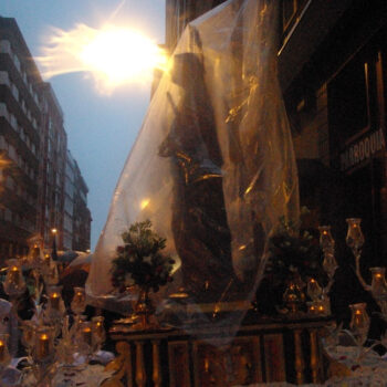 Despois de un acortado recorrido a causa da choiva, a procesión da nosa señora das angustias chega de novo ao templo da parroquia de fátima. Grande contraste entre os momentos de silencio e os de apabullamento protagonizados pola banda. @s costeleri@s pasan gran traballo para conseguir encarar o paso na igrexa, coordinados polo mestre costeleiro e a sua campana, pero finalmente consígueno entre os aplausos da xente presente. Foto de Ramón Neary