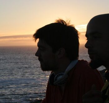 Gravación nos Castros de Baroña. Berio e Chiu escoitan o ruido branco do mar dende un dos acantilados do oeste. Despois do solpor.