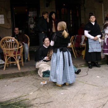Praza da Constitución en Vigo. Domingo 1 de abril, celebración do día da Reconquista (trasladado dende o 28 de marzo). Dúas pandereteiras interpretan unha peza sentadas baixo uns soportais.