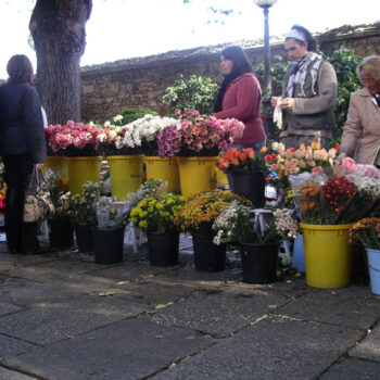 Dia de difuntos. A xente acode a levar as flores. As floreiras afánanse na entrada do cimiterio a vender o xénero. Prasticos, tixeiras, precios, xente negociando…