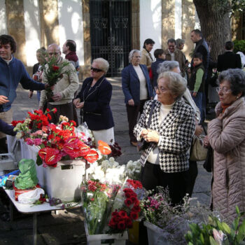 As floreiras afananse en atender ós clientes na porta do cimiterio. Bolsas de prástico, tixeiras, precios, e xente, paseniña, pero moita…