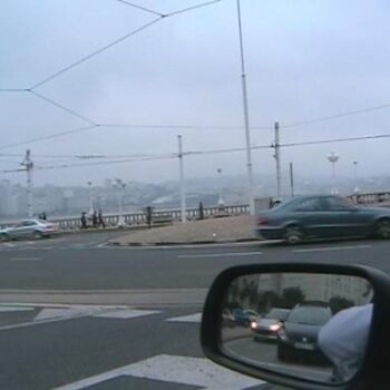 Un domingo frío de outono pola tarde pouca é a xente que pasea a pe, prefiren os coches. Estes pasan ao ritmo intermitente marcado polo semáforos. Hai pouco que choveu i o chan está mollado. De repente un tranvía… Trafico perezoso de domingo pola tarde. De fondo as gaivotas e o permanente mar.
