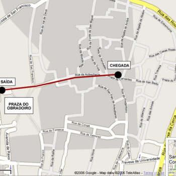 Do obradoiro a Cervantes A praza está case deserta. No arco de Fonseca, un gaiteiro ameaza con comezar a tocar, pero semella que non está inspirado abondo. A xente pasa por diante da fachada da catedral nun fluxo constante. Cruzámolo e encontramos que o gaiteiro departe cun amigo no lugar de tocar. En chegando á Acibecharía cruzamos cun taxi, e ameaza de novo o gaiteiro coas súas tentativas. Algo máis arriba, dous bares compiten coa súa música. En chegando á praza de Cervantes un grupo de xente fala en alto desde os soportais, e chega a nós o son da fonte, que en segundo nos achegamos a ela, vaino enchendo todo.