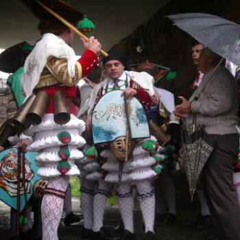 Entrevista e saída dos peliqueiros da fronte da igrexa. Nesta toma escoitamos moitos cencerros que desprazan e entrelazan o seu son.