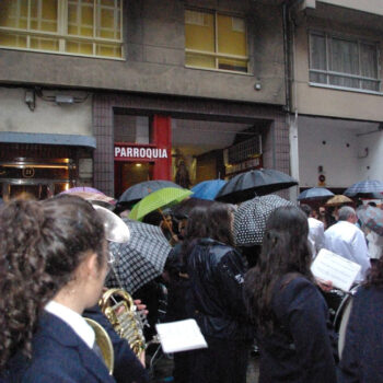 Rios e rios de xente, charlando animadamente, esperando a saida da procesión na porta da moderna igrexa. Mentres, o estribillar de algún plástico no medio das voces, recorda que o día estaba chuvioso e que a virxe tivo que sair protexida para que no perdera a sua cor. Foto de Ramón Neary
