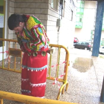 Esta toma corresponde a un boteiro, personaxe característico do entroido en Viana do bolo, neste lugar utilizan campás de bronce e por esa razón o son é diferente das chócas que utilizan os peliqueiros en Laza. Nesta paisaxe sonora podemos escoitar tamén o folión dos que comen, foguetes, voces e tamen a choiva que nos acompaño durante todo este traballo de campo.