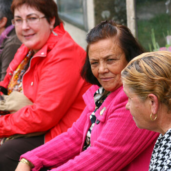 Asistentes ao encontro Campás e Campaneiros (2009) organizado pola asociación Os Chichisos falan dos campaneiros mentras sonan as bombas de palenque que anuncian o inicio do evento