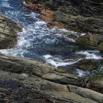 Serie Sons da Costa Ribadeo – Punta do Gaín Un pico de mar abrupto que parece querer protexer agarimosamente unha pequena praia, chamada areosa, inde que, o que menos abunda nela son areas. As ondiñas do Cantábrico chegan mansas i enchen todo o espectro de agudos que reburbullan no seu continuo ir e vir. De cando en vez, un toque de onda feroz, que enche todo de espuma, e depois, outra vez, tranquilidade… As veces, aparece alguen paseando só, ou co seu can.