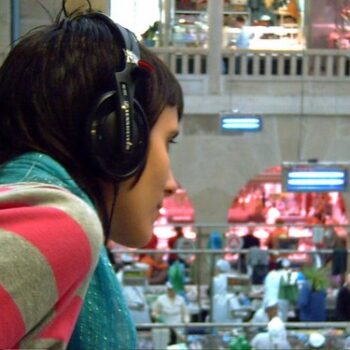 Gravación na Praza de Abastos de Pontevedra, zona da verdura, xente falando e facendo compras, reverberación da zona de abaixo.