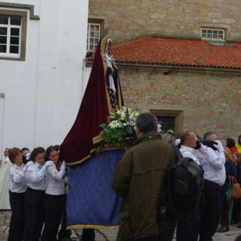 A xente espera na saida da procesión, memtres un barullo de tambores, gaitas e metais anuncia a quen queira escoitar o arranque da procesión. Aplausos cando @s colsteleiros sacan as imaxes da igrexa. Foto de Pilar Vila.