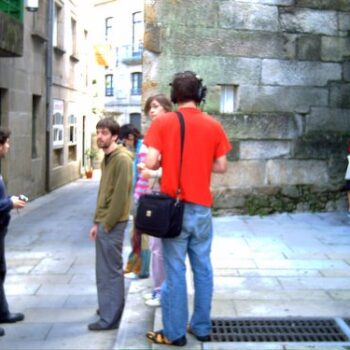 Praza de Curros Enrriquez detras do Casino de Pontevedra, mistura de sons dunha cafetería, ensaio nunha escola de música, coches, xente e paxaros.