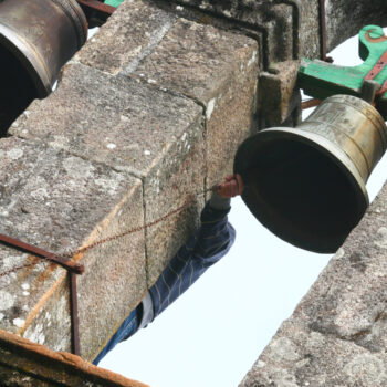 Corte 3/4 do etnógrafo Xerardo Dasairas presentando o seu libro Campás e Campaneiros no encontro organizado pola asociación Os Chichisos no 2009 que baixo o mesmo nome agrupa a campaneiros da zona para interpretar os toques tradicionáis